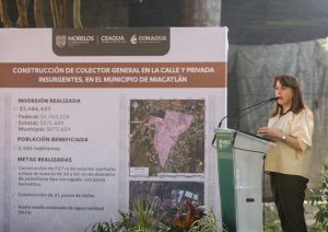 En Miacatlán, la mandataria estatal inauguró un colector general de aguas residuales que permitirá conducir las descargas hacia una planta de tratamiento, lo que fortalecerá el cuidado ambiental y la salud pública; la obra se realizó mediante el programa Proagua, con una inversión tripartita de más de tres millones 486 mil pesos, en beneficio de cerca de tres mil habitantes.