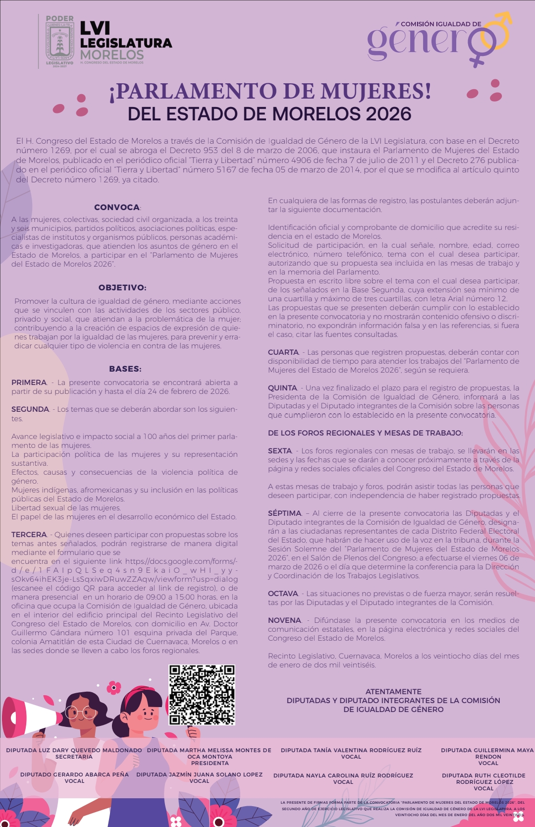 📢 Convoca diputada Martha Melissa Montes de Oca Montoya, presidenta de la Comisión de Igualdad de Género del Congreso del Estado de Morelos, al Parlamento de Mujeres Morelos 2026👩⚖️ con el objetivo de fortalecer la igualdad y erradicar la violencia de género.